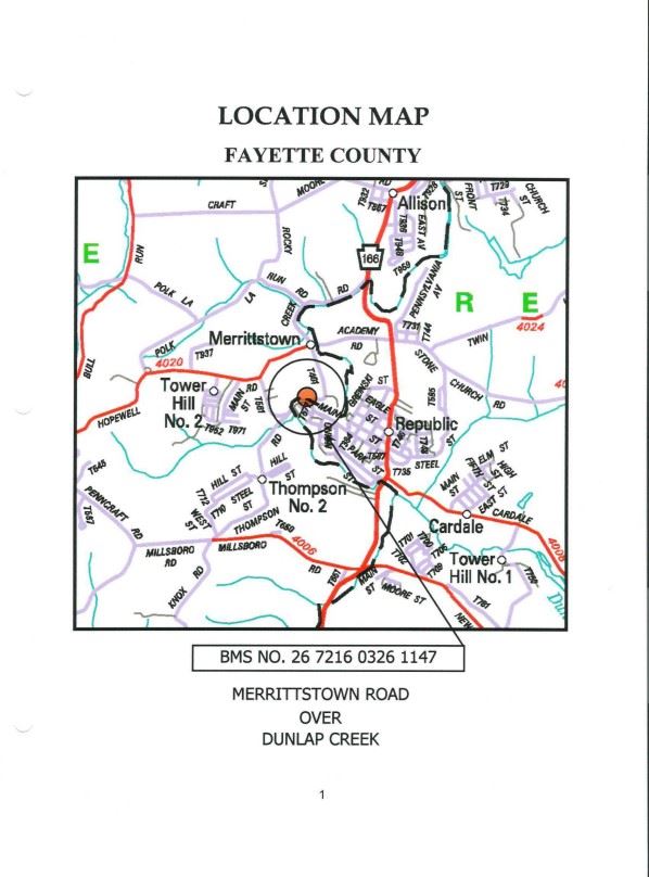 Luzerne and Redstone Townships carrying Merrittstown Road over Dunlap Creek, just west of Republic, south of S.R. 4020.